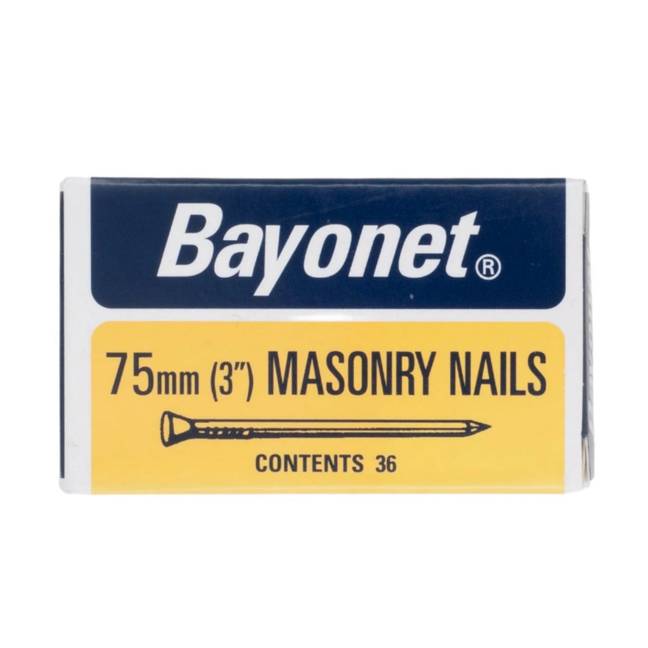 Masonry Nails - Hardened. Masonry nails are specially hardened and have spiral flutes for fastening objects to masonry by driving into the mortar joints. Sold individually or in packs of 6. Assured quality with our famous Challenge brand.